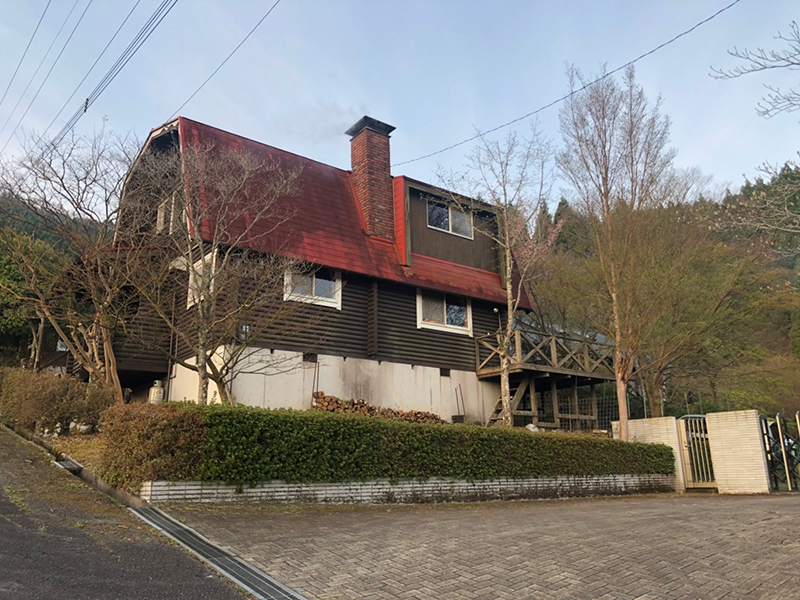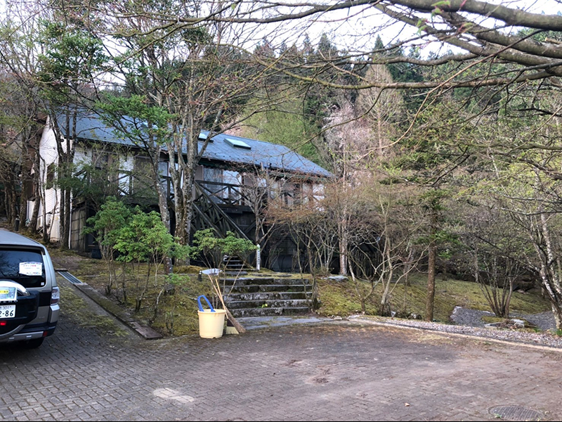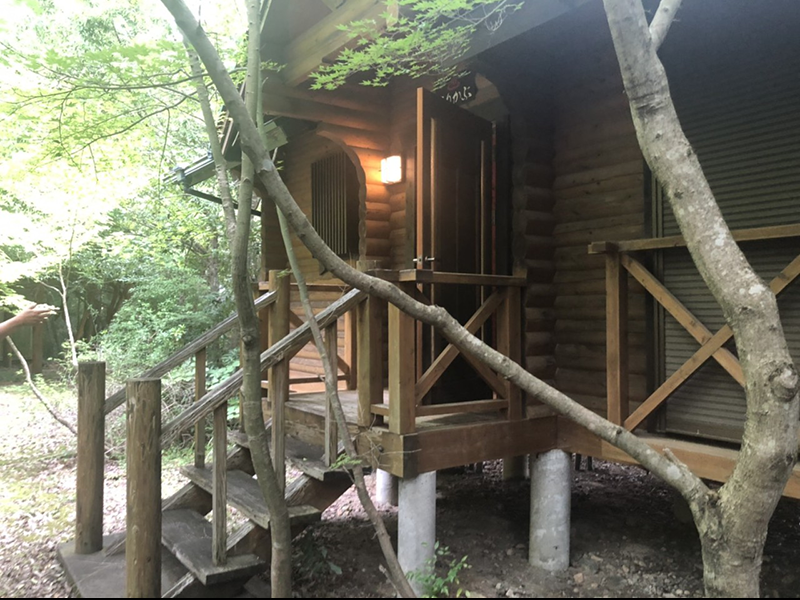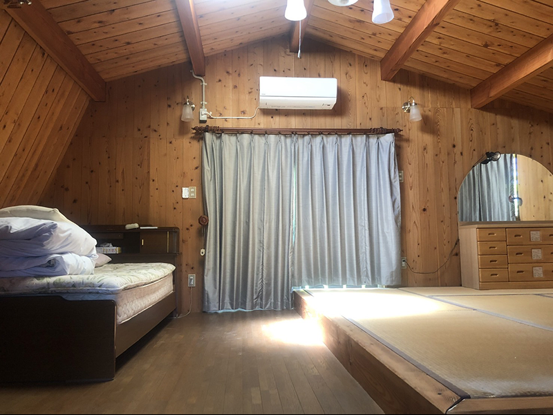 - 是原木屋,1楼是客厅,2楼是床和榻榻米在一起的卧室。