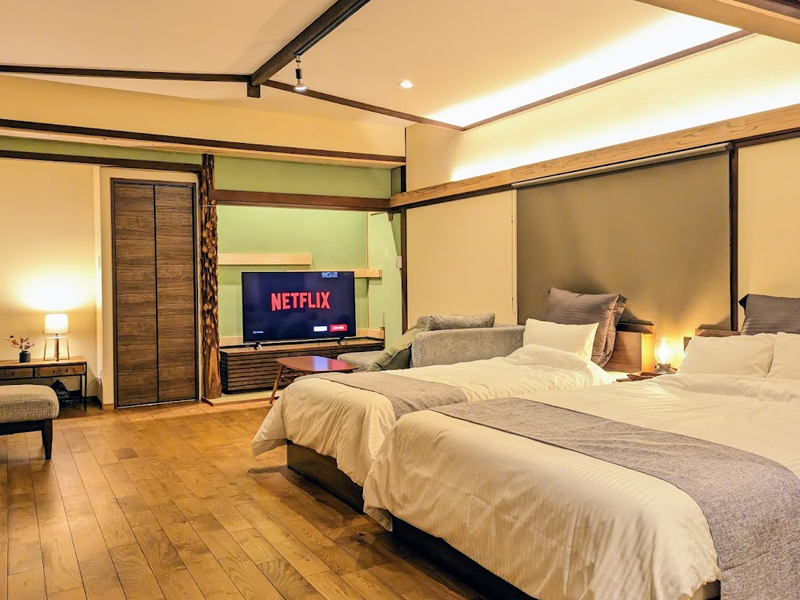 - 45㎡の広々とした客室に、2台のベッド(ダブルベッド1台、シングルベッド1台)と、ゆっくり寛いでいただけるリビングスペースをご用意しております。