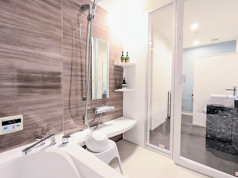 - 浴室はトイレや洗面所とはガラス扉で区切られ独立しております。
